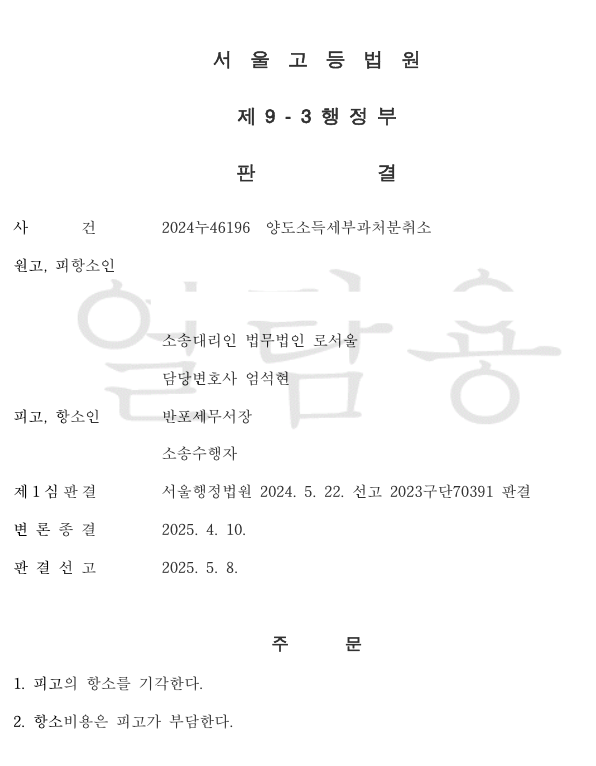 서울행정법원에 이어 서울고등법원 재판부 또한 법무법인 로서울의 손을 들어주었습니다. 재판부는 세무서의 항소를 기각하며 세금 부과 처분을 전액 취소하라고 판결했습니다.