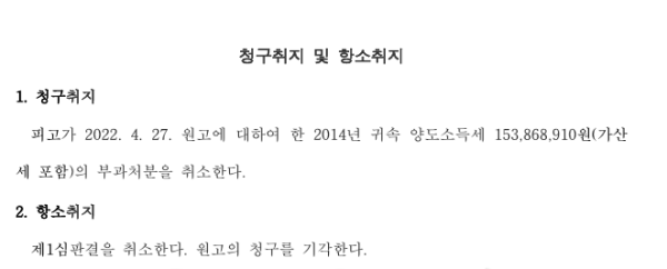 재판부는 판결문에서 "원고에게는 세법상 '양도'로 볼 만한 것이 일체 존재하지 않는다 ", "존재하지도 않는 양도를 가지고 이루어진 부과처분은 위법하다 "고 명시하며 저희 측 주장을 완벽하게 받아들였습니다.